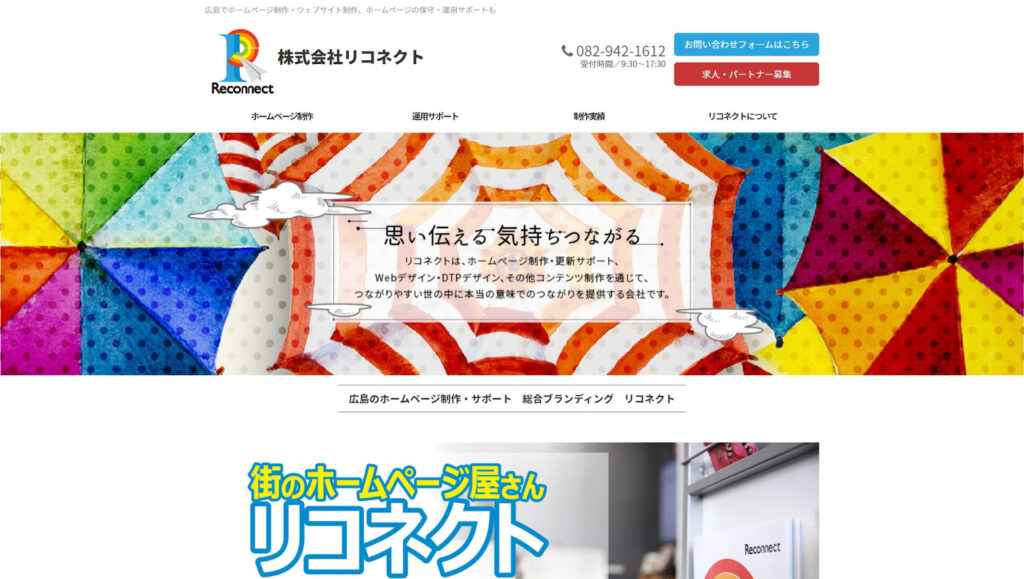 株式会社リコネクトは、「街のホームページ屋さん」という親しみやすいコンセプトを掲げる広島の制作会社です。IT企業にありがちな堅苦しいイメージとは一線を画し、カフェのようなガラス張りのオフィスで、誰もが気軽に相談できる身近な存在を目指しています。