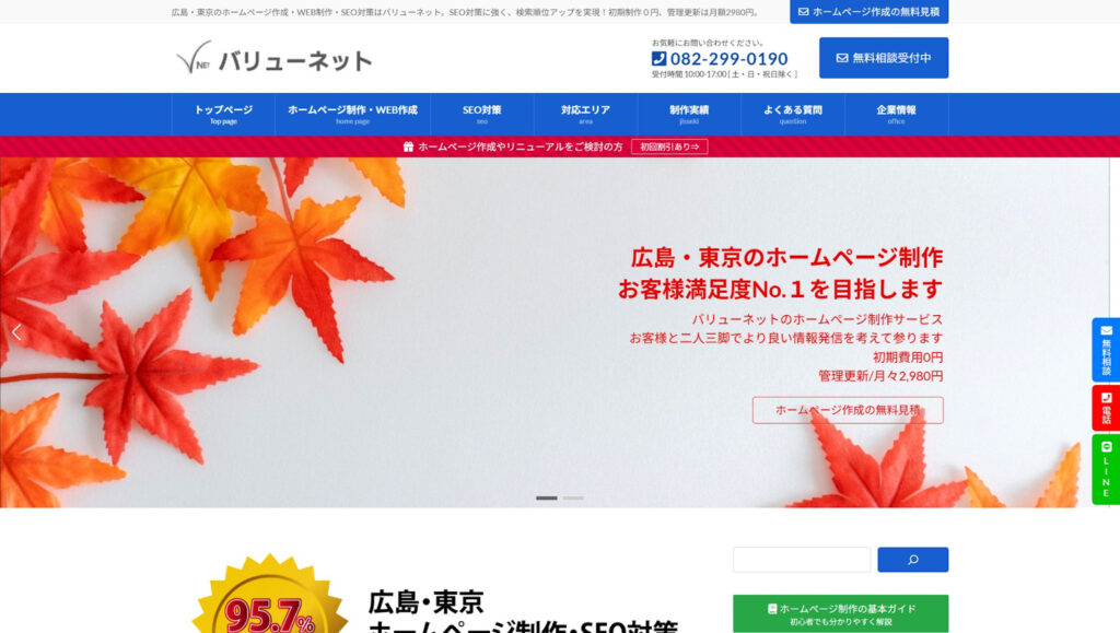 バリューネットは、広島と東京を拠点に「お客様満足度No.1」を目指すホームページ制作会社です。創業10年以上、600サイトを超える豊富な実績を持ち、「初期費用0円、月額2,980円から」という圧倒的な低価格プランで企業のWEB活用を支援します。