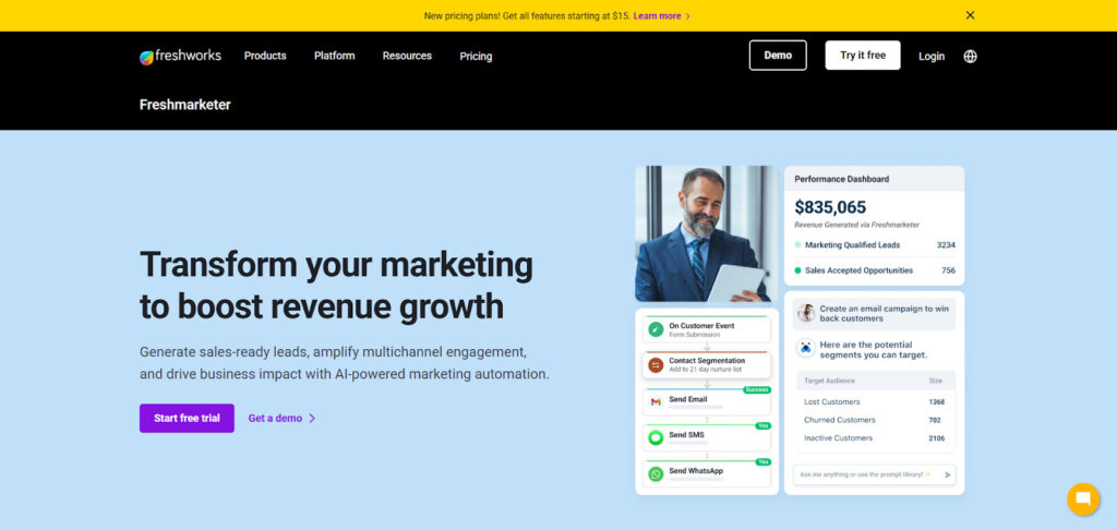 Freshmarketerは、Freshworks Inc.が提供するマーケティングオートメーションツールで、ABテスト機能を無料プランから利用できる点が魅力です。