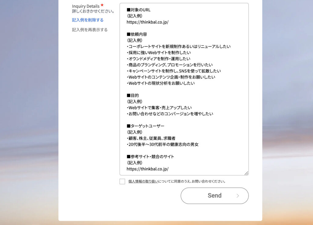 フォームの内容によっても異なりますが、細かく記入例を記載しておくことでユーザーも安心して入力をすることができるので、ユーザーファーストにつながります。