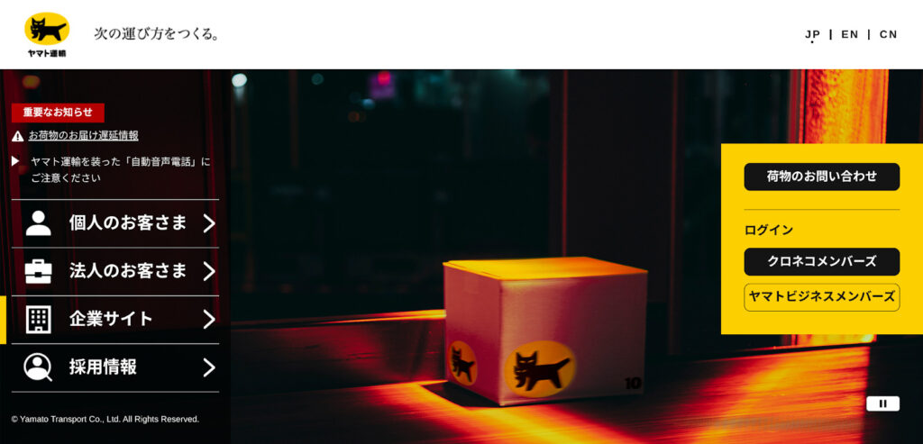 ヤマト運輸のWebサイトは、トップページで「個人のお客様」「法人のお客様」「企業サイト」「採用情報」と明確に導線を分け、それぞれのユーザーが必要な情報へ迷わずアクセスできる設計です。個人向けページでは「荷物を送る」「荷物を受け取る」という行動ベースのメニュー構成で、直感的な操作を実現しています。