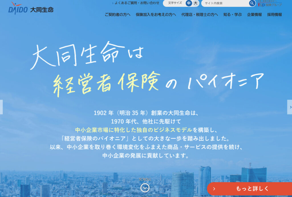 大同生命は中小企業に特化した「経営者保険のパイオニア」として、1902年に創業された会社です。大同生命のWebサイトで特に優れている部分はサイト全体のわかりやすさでしょう。