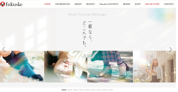 福助株式会社のコーポレートサイトは、商品の品質とものづくりへのこだわりを視覚的に伝えるデザインです。ファーストビューでは商品画像を全面に配置し、ブランドロゴを中央に据えたシンプルな構成となっています。