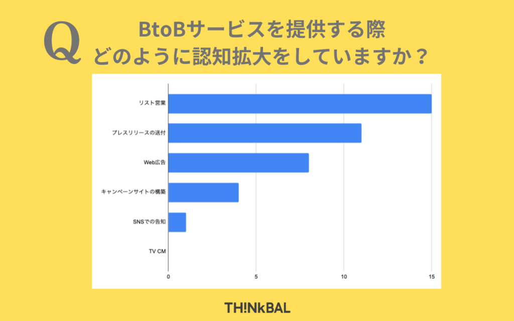 BtoBサービスを提供している企業に、認知拡大の方法についてアンケート調査を実施。60%の企業は、リスト営業での認知拡大を行なっており、こちらが一番多い結果となりました。