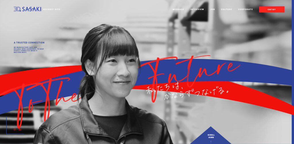 例えば、株式会社ササキ様の採用サイトでは、モノクロ写真と鮮やかなカラーを配したクールなデザインにより「製造業のかっこよさ」を体現しています。