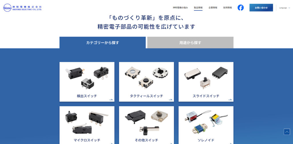 具体例として、神明電機株式会社様では、製品名だけでなく「スマートフォン用」「車載用」といった「用途」から検索できる設計を採用しています。