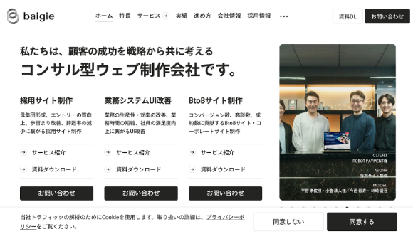 代表の宮崎氏は電通でナショナルブランドのWebサイトを数多くプロデュースした経験を持ち、その知見を活かして企業のビジョンや価値観を求職者に効果的に伝えるコンテンツ設計を実現します。徹底したヒアリングと市場分析により、競合との差別化を図りながら、応募者とのミスマッチを防ぐ採用サイトを制作できる点が特徴です。
