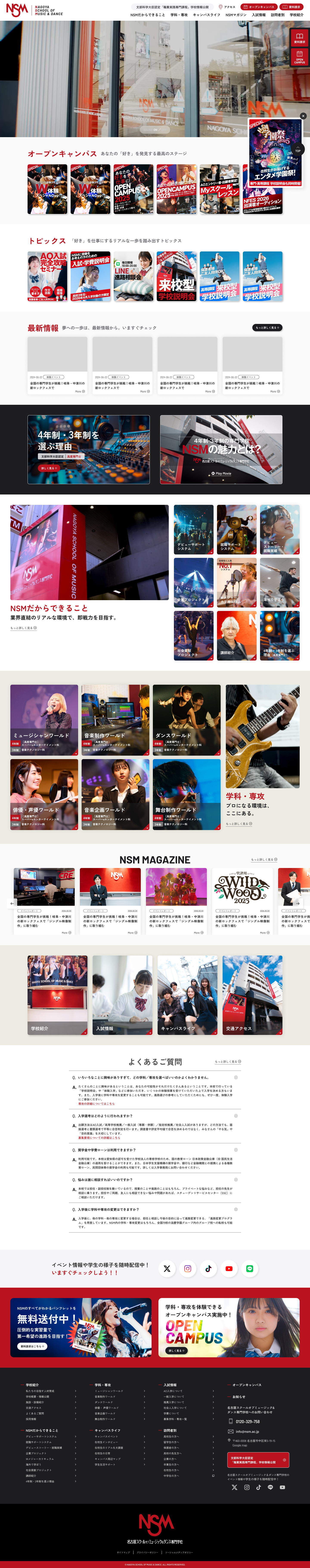 名古屋スクールオブミュージック&ダンス専門学校様の学校サイトリニューアルに携わりました。今回のリニューアルでは、2027年度募集より全専攻が4年制へ変更になる大きな節目に合わせ、プロの現場で即戦力となるための高度な教育環境と、4年間で才能を育める価値を戦略的にデザインに落とし込みました。メインターゲットである高校生へ「学校のリアルな熱量」を届けるため、動画コンテンツを大幅に強化。自社で企画から撮影・編集まで一貫して手がけ、ステージの臨場感や学生たちの活気を表現しました。また、入学検討者の期待感に寄り添った導線設計の見直しにより、資料請求やオープンキャンパス予約といったCTAへのアクセスを最適化。高度な学びを追求する学校の姿勢と、次世代のクリエイター・アーティストを惹きつけるエネルギーが共鳴する専門学校サイトへと進化させました。