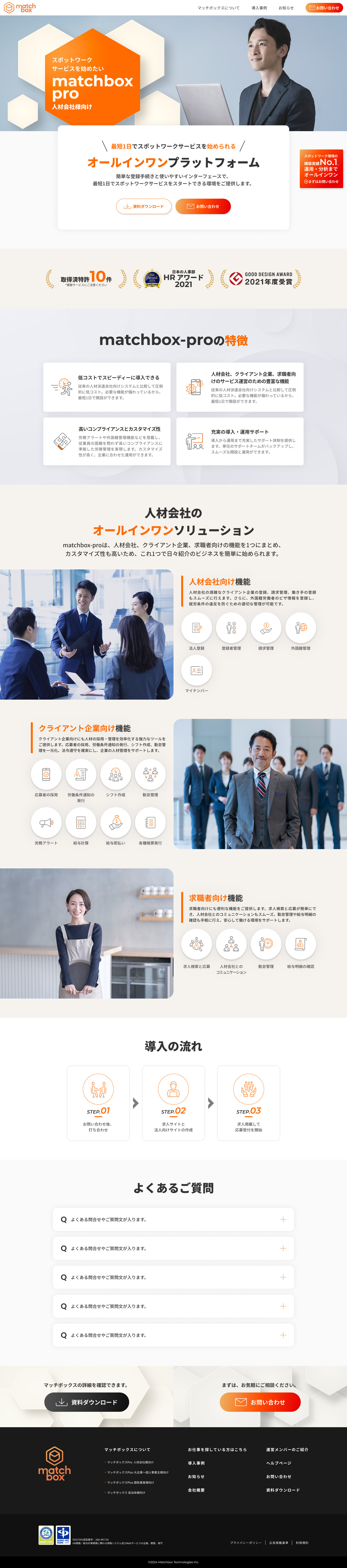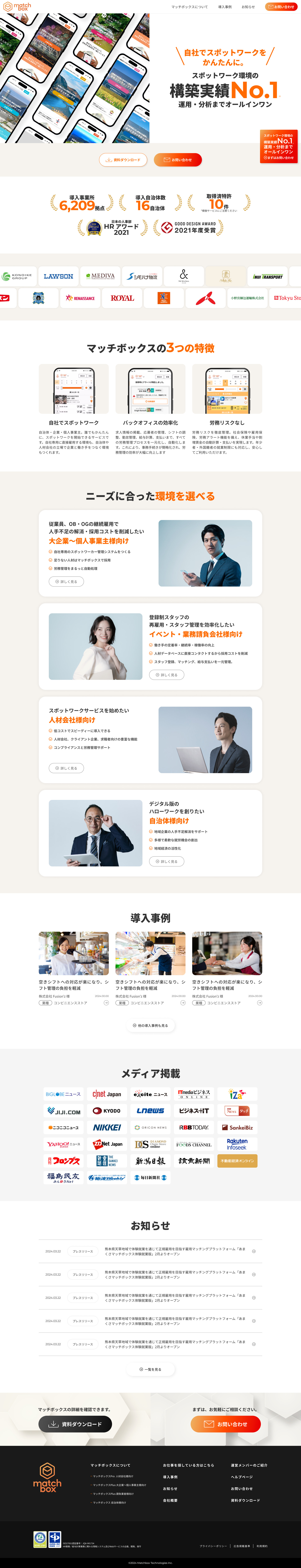 株式会社Matchbox Technologies様が展開する、スキマバイト/スポットワーク内製化システム「マッチボックス」のサイト制作に携わりました。本プロジェクトでは、スポットワーク市場の急速な拡大に伴う多様なニーズに応えるため、サイト全体の構造を一新。企業・人材派遣会社・自治体といった異なる属性のターゲットに対し、それぞれの課題解決(コスト削減、労働力不足解消、業務効率化)を最提示する情報設計を行いました。デザイン面では、HRテックとしての先進性と、自治体にも選ばれる高い信頼性を両立。特許取得済みの強みや豊富な導入実績をビジュアル化し、検討フェーズのユーザーが導入後のメリットを具体的にイメージできる構成としています。