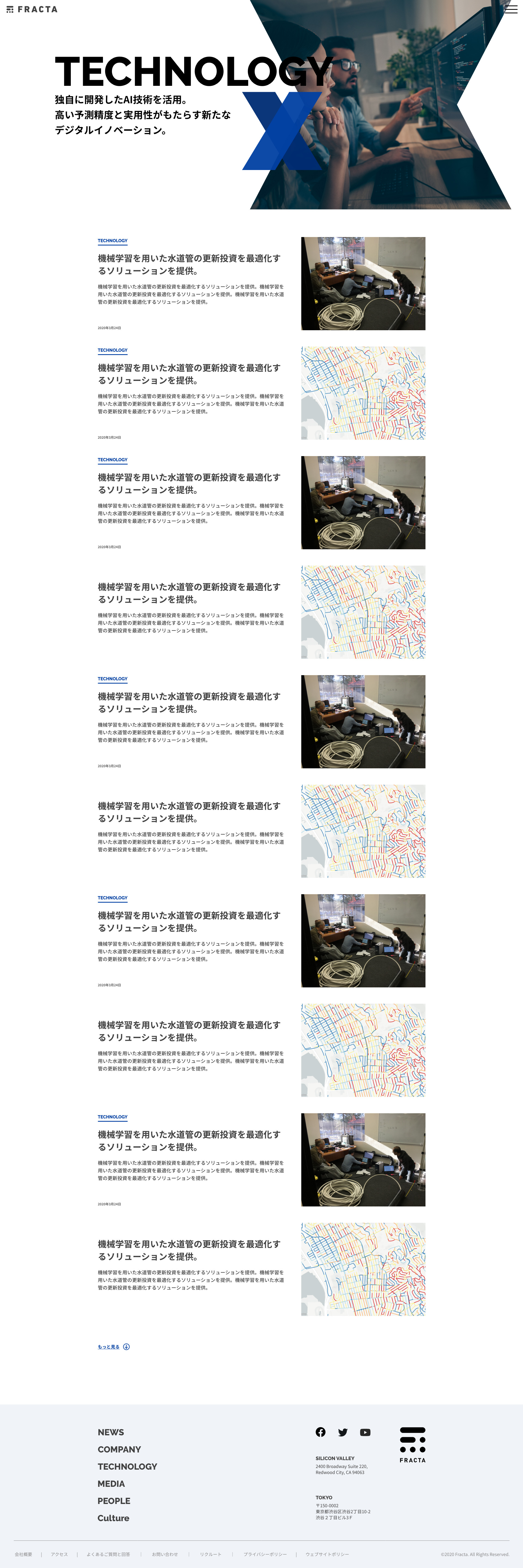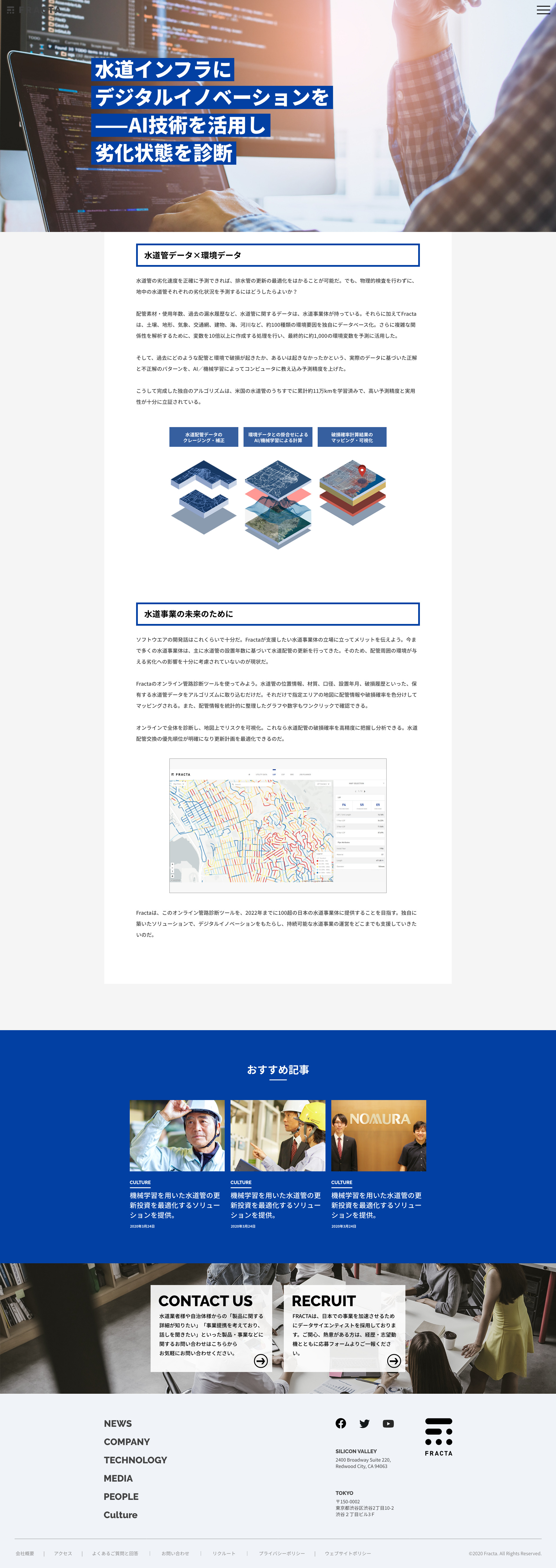 水道・鉄道などAI(人工知能)/機械学習用いて各種インフラの劣化状況を予測するソフトウェアサービスを提供している企業様のサイトリニューアルを行いました。クライントと代理店の要望で更新性を重視とデザインに拘る内容の結果、WordPressでの構築が難しくなったが、なんとか駆使しサイト全体を制作対応しました。かなりの難題でも克服した案件になりました。